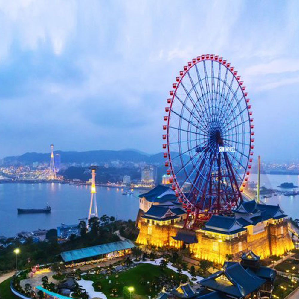 太陽之眼摩天輪是下龍灣的著名地標,以高達近 215 公尺、越南最高的摩天輪聞名。搭配女皇雙層纜車組成的空中遊樂體驗,白天能俯瞰下龍灣翠綠海面與奇岩地貌,夜晚則可欣賞城市點亮後的浪漫夜景。緩慢升空的過程既放鬆又震撼,是感受下龍灣魅力的最佳方式之一。